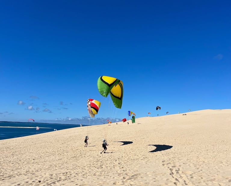 Bienvenue à la Dune du Pilat, un terrain de jeu incroyable pour tous les amoureux de vol libre. Ce stage de 5 jours est spécialement conçu pour vous perfectionner en gonflage, décollage et techniques de contrôle de votre voile, tout en profitant d’un cadre exceptionnel. Avec l’océan à perte de vue d’un côté et la forêt des Landes de l’autre, chaque instant sera magique.